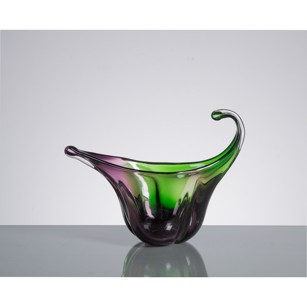 Centrotavola in vetro sommerso nei toni verde e lilla, corpo concavo schiacciato con versatoio ed ansa aperta.