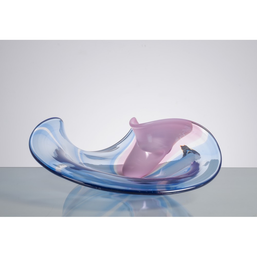 Centrotavola in vetro sommerso blu e lilla, corpo concavo ondulato con ampio movimento.