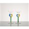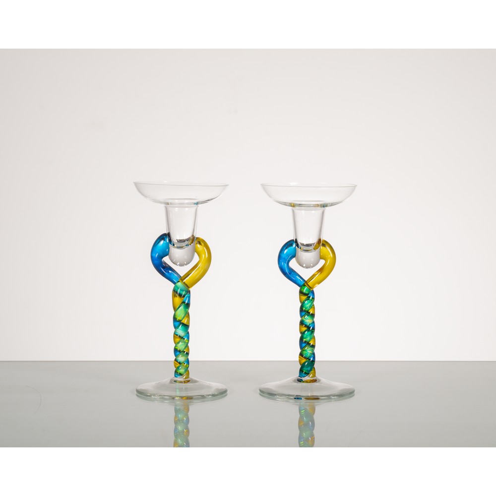 Coppia di monocera in vetro, gambo a torchon in vetro colorato nei toni blu e giallo, coppa in vetro trasparente, piede circolare.