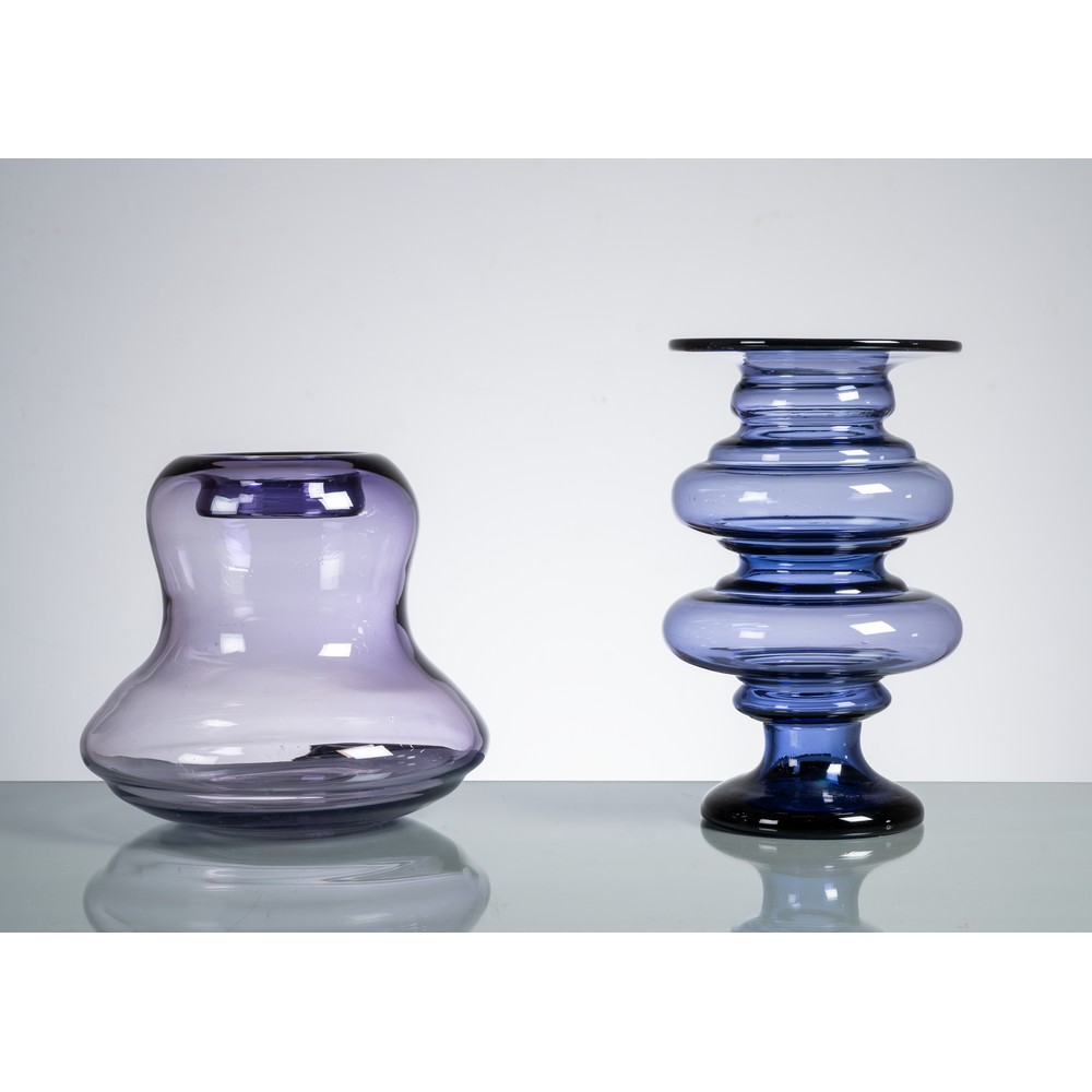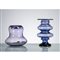 Due vasi in vetro soffiato nei toni viola, uno con corpo a pera e bocca piana introflessa, uno con corpo ad anelli, piede a svasare e bocca circolare estroflessa piana.