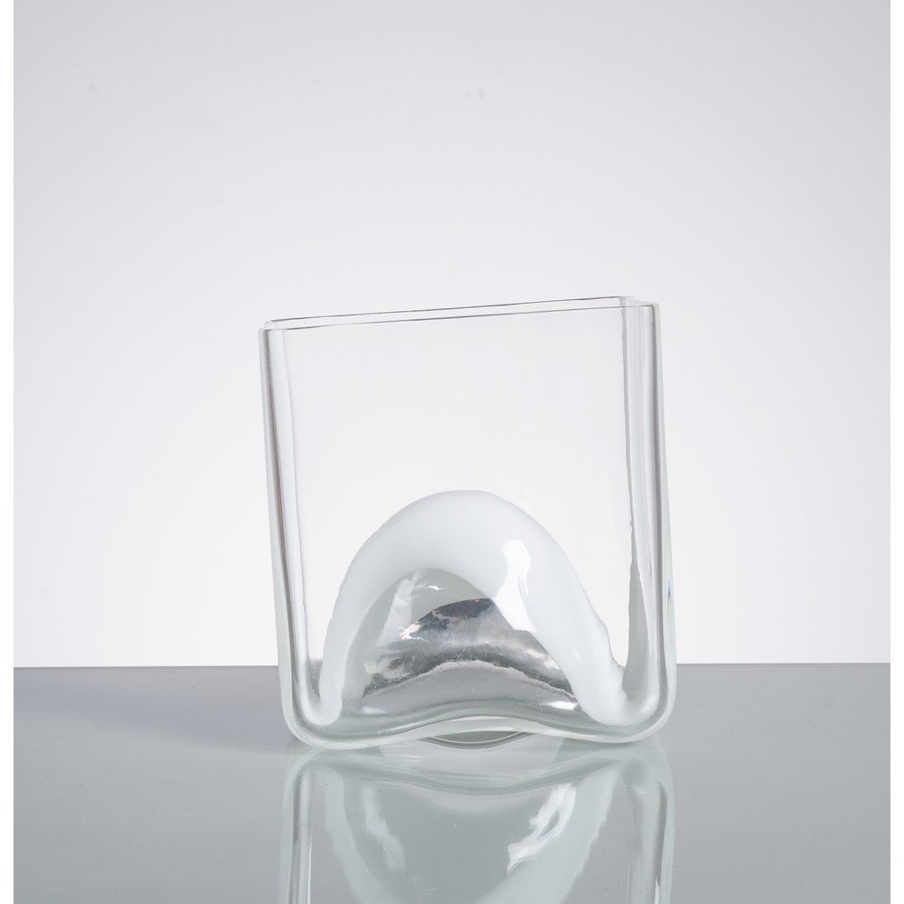 Vaso scultura in vetro trasparente con murrina lattimo, corpo cubico con bocca rettangolare piana.