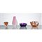 Tre posacenere in vetro sommerso, uno sfaccettato in vetro sommerso fumè, uno di forma circolare viola, uno bullicante trasparente e ambra. Un vaso solifleur in vetro sommerso rosa, corpo a goccia con bocca piana.