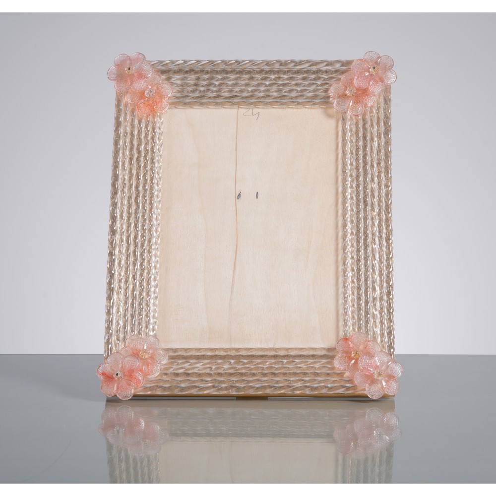 Cornice portafoto in vetro a canne ritorte trasparenti e oro, decoro negli angoli con fiori in vetro rosa.