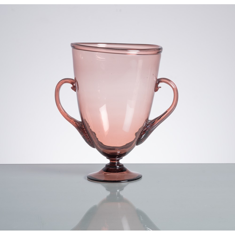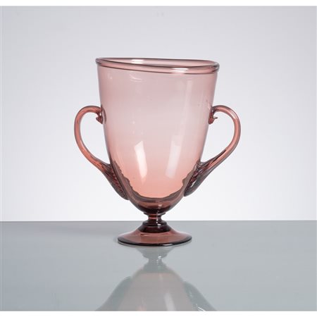 Vaso biansato in vetro soffiato nei toni del lilla, corpo a campana su base circolare con corto gambo, bocca circolare piana, filè.