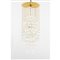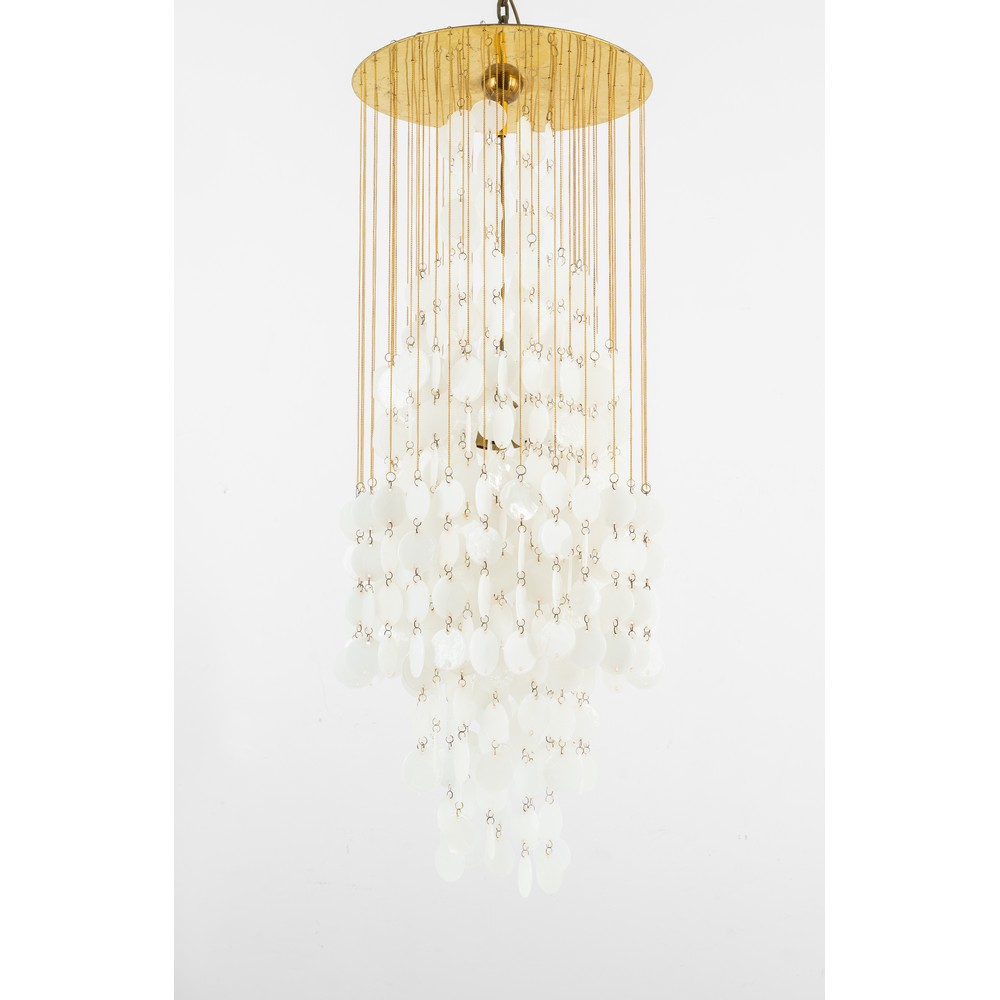 Lampada a sospensione a cinque luci modello "Shell Fun", dischi in vetro opaline su catene dorate, struttura in metallo dorato.