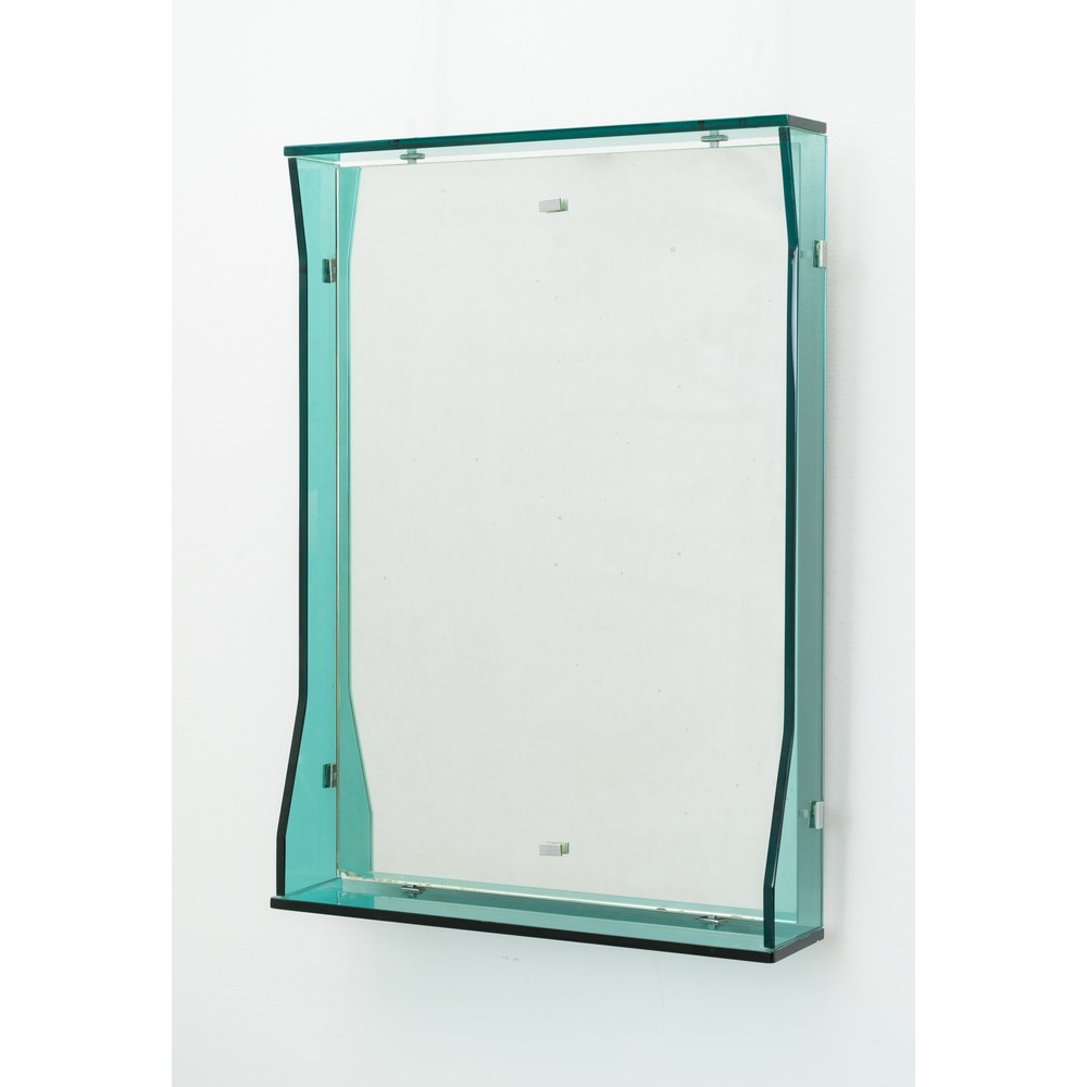 Specchio da parete rettangolare, cristallo specchiato, cristallo molato verde nilo, sostegni in ottone.