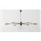 Lampada a sospensione a sei luci, struttura a raggiera in ottone e metallo verniciato nero, diffusori a coppa