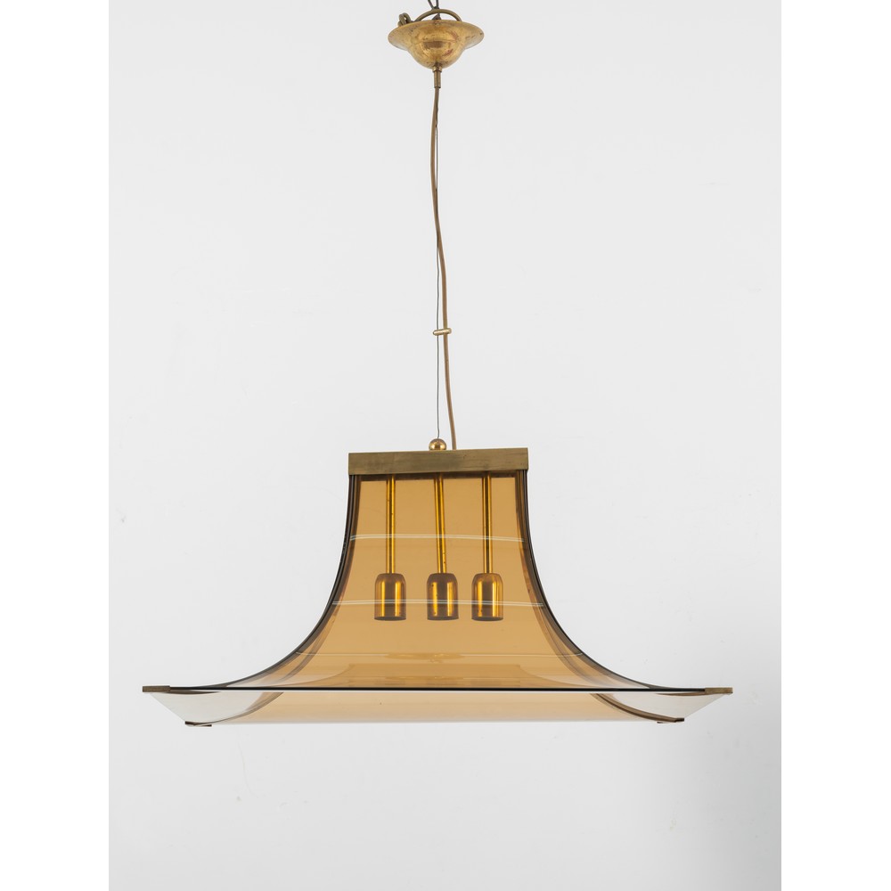 Lampada a sospensione a tre luci, modello “Pagoda” struttura in ottone con vetri curvi fumè.