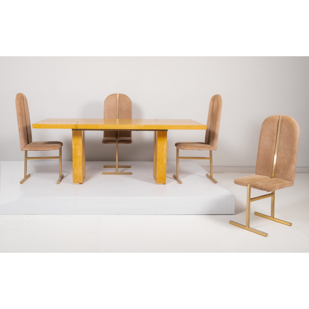 Tavolo da pranzo in radica di acero e ottone, piano rettangolare con tarsie curve in ottone; quattro sedie con struttura in ottone, seduta e spalliera imbottite e rivestite con tessuto di velluto nei toni tortora.