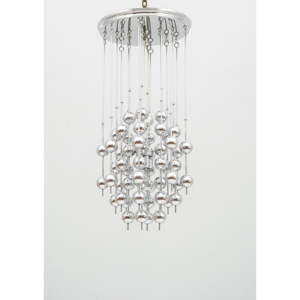 Lampada a sospensione a otto luci modello "Lüber Ball", sfere di metallo cromato sospese a 21 aste d'acciaio pendenti da un disco in metallo cromato.