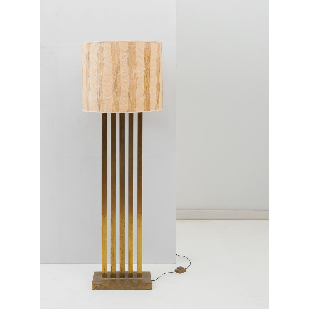 Lampada da terra ad una luce in ottone, composta da cinque elementi quadrangolari su base rettangolare, diffusore cilindrico nei toni avorio. Ossidazioni.