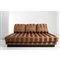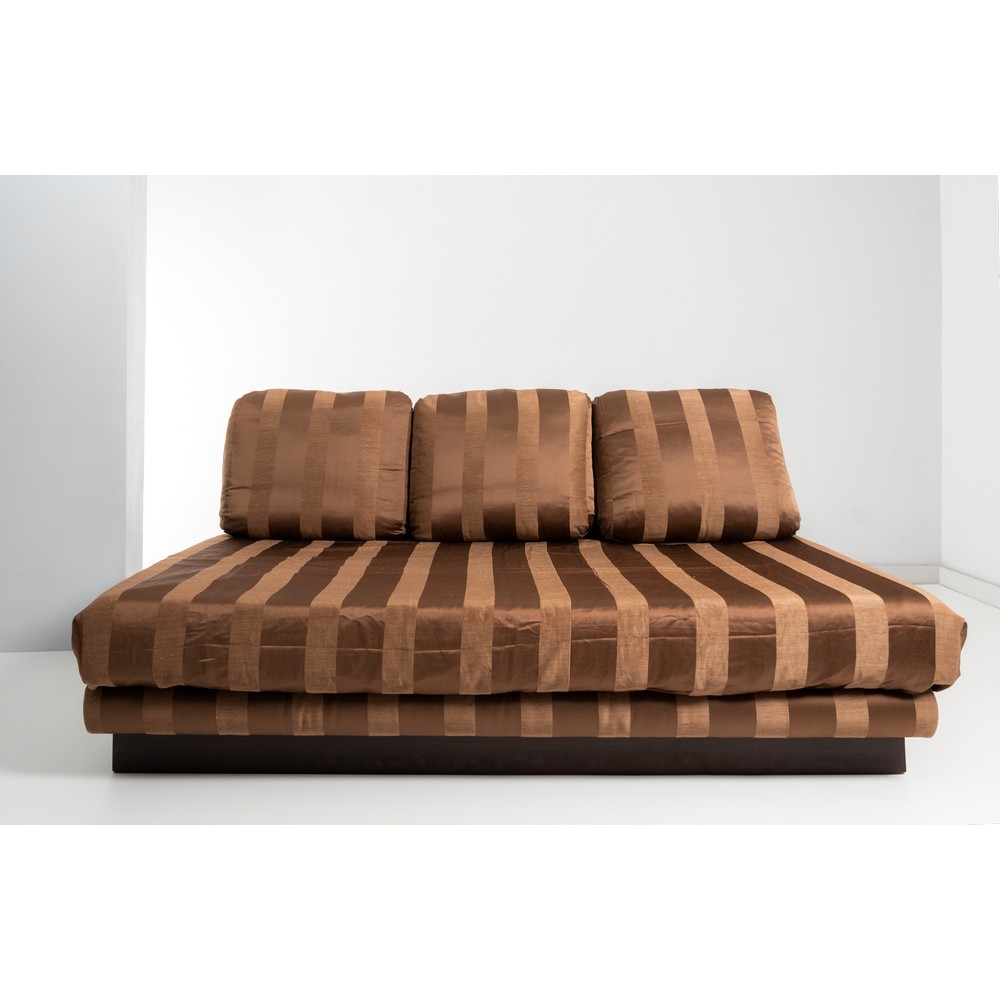 Divano letto a tre posti una piazza e mezza, struttura in legno con imbottitura e rivestimento in pregiato tessuto di Rubelli a righe marrone scuro.
