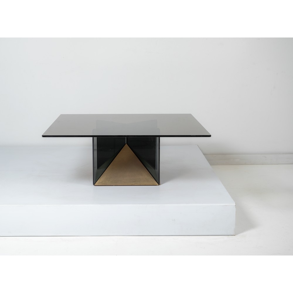 Tavolo basso in vetro specchiato ed ottone, piede cubico, piano quadrato in vetro fumè.