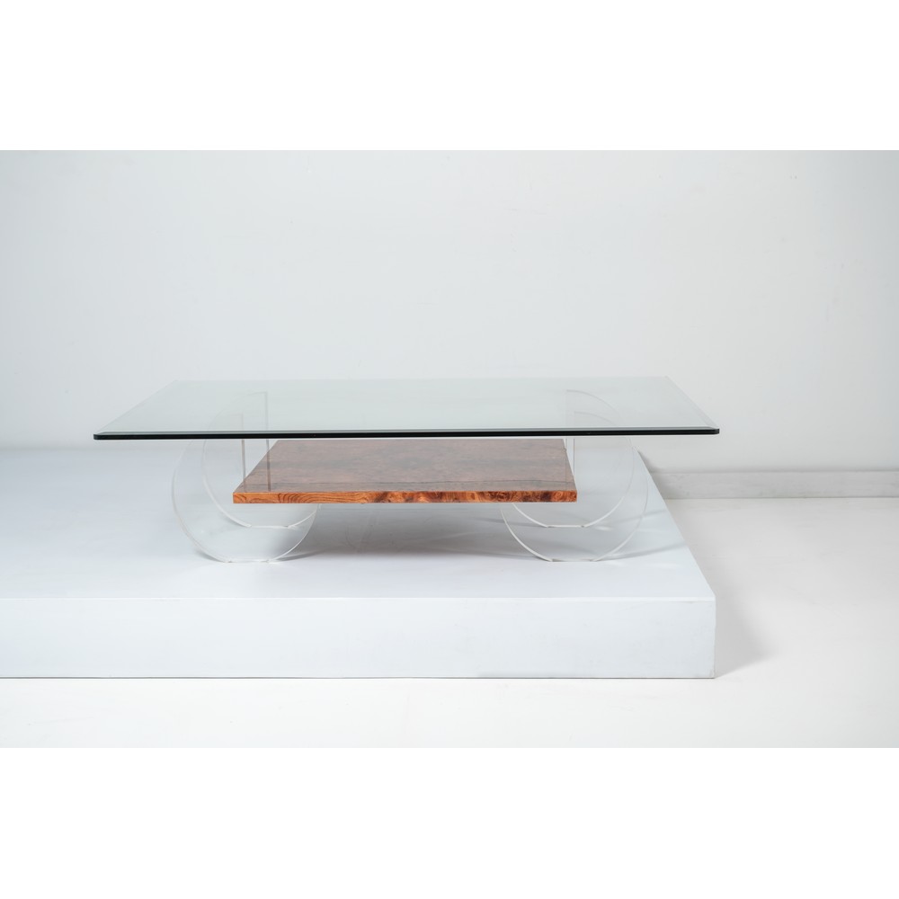 Tavolo basso con piede in plexiglass trasparente, piano rettangolare in vetro di grosso spessore bisellato, sottopiano in radica.