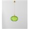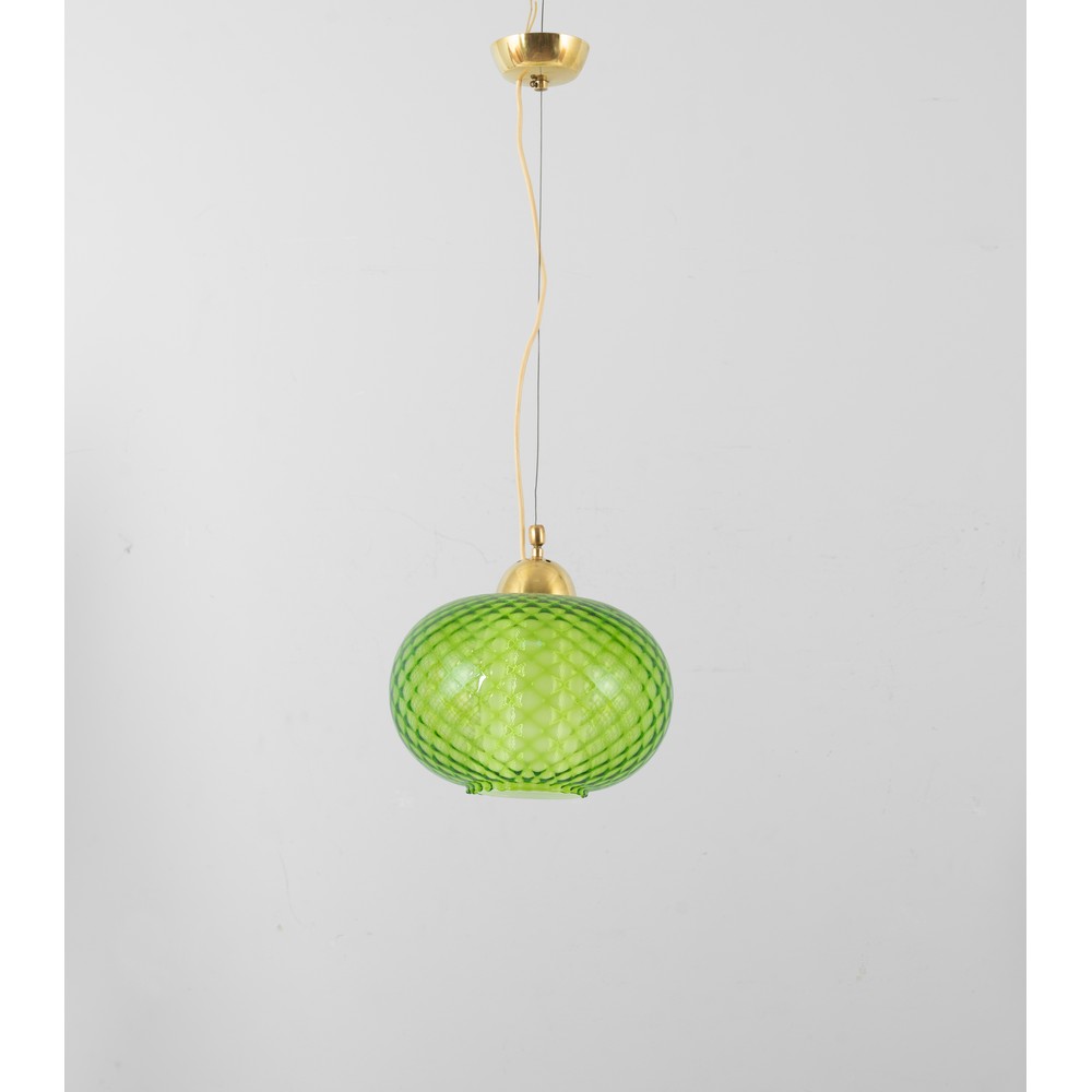 Lampada a sospensione ad una luce, diffusore sferico schiacciato in vetro reticolato nei toni del verde, elementi di giunzione in metallo dorato, cavo metallico.