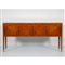 Sideboard in legno massello e impiallacciato in radica di acero, corpo rettangolare, piano con angoli arrotondati, sul fronte quattro vani ad anta battente. Piede a sciabola con scarpetta in ottone. Usure.