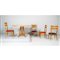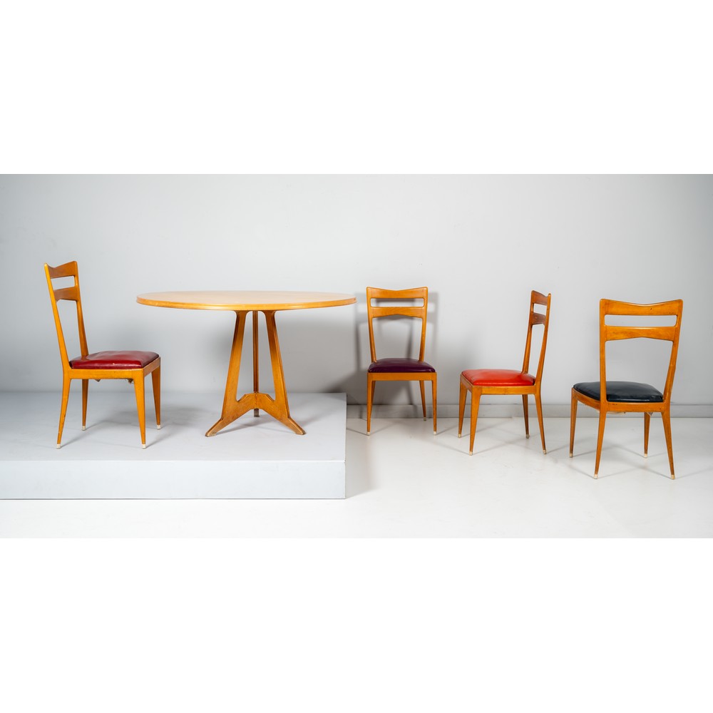 Tavolo da pranzo in legno di faggio, piano circolare, piede a sagoma geometrica; quattro sedie in legno di faggio, spalliera traforata, seduta imbottita e rivestite con skai di colore diverso.
