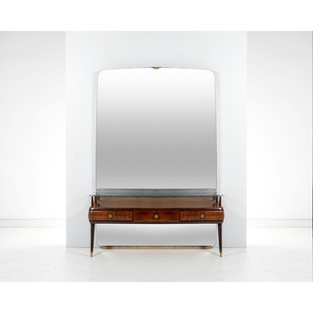 Toletta in legno di palissandro e legno ebanizzato, tre cassetti sul fronte, un piano in legno e un piano in vetro trasparente di forma rettangolare con angoli arrotondati, grande specchio sovrastante con decorazione in ottone. Due piedi a sciabola con scarpette in ottone. Usure.