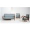 Salotto composto da un divano a due posti e da due poltrone, struttura in legno con seduta e spalliera imbottite e rivestite con tessuto nei toni del blu.