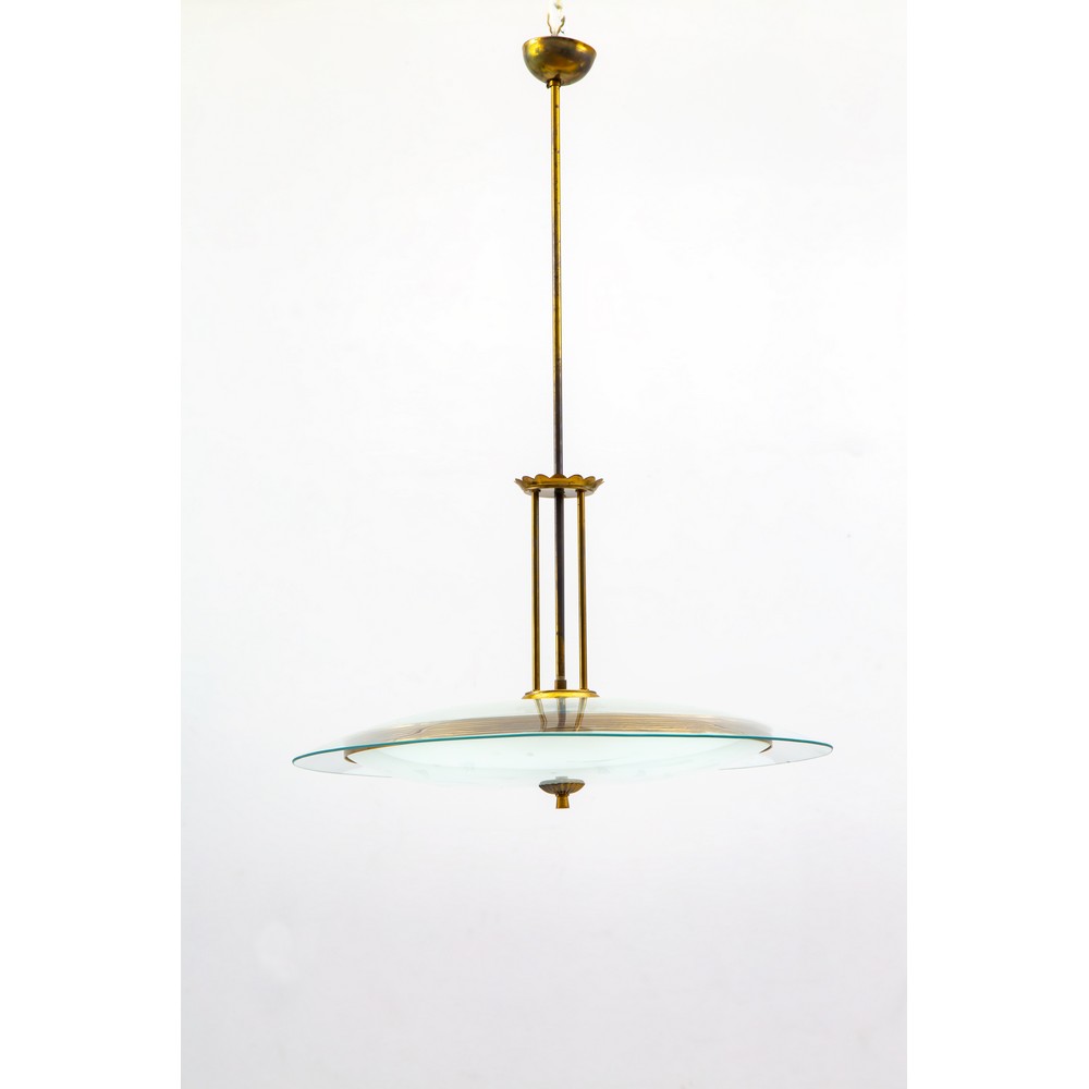 Lampada a sospensione a due luci, realizzata sovrapponendo due dischi di vetro, quello superiore trasparente, quello inferiore in vetro con dettagli floreali stilizzati satinati, struttura in ottone.
