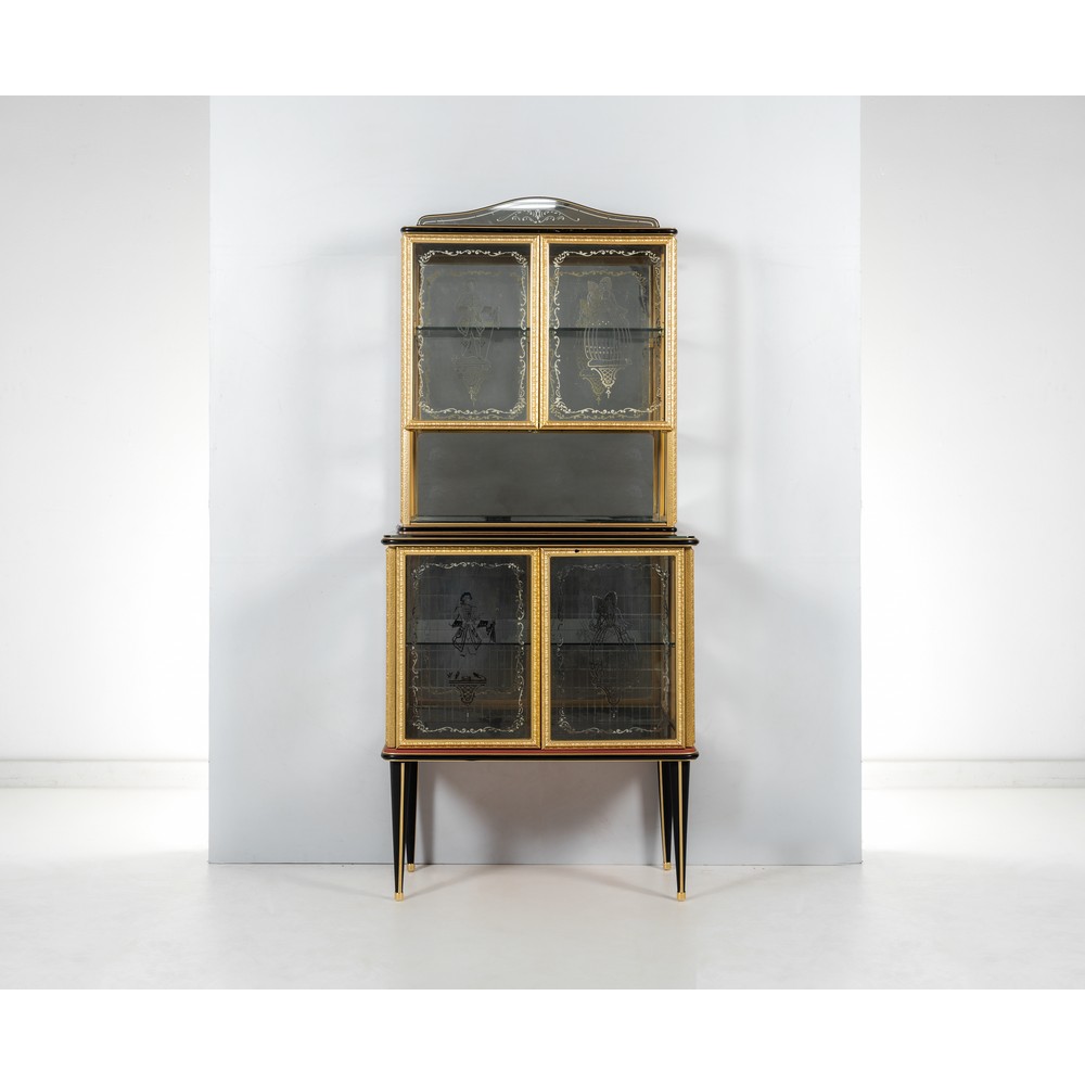 Mobile bar a doppio corpo in legno rivestito in pelle e legno laccato, nella parte inferiore va a bar, due ante battenti decorato con vetro inciso con figure, interno decorato con vetri specchiati; vano a giorno e vano chiuso con ante battenti e vetri decorati e incisi nella parte superiore, elementi in metallo dorato.