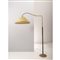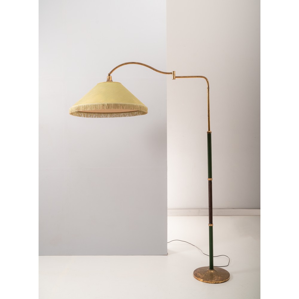 Lampada da terra ad una luce in ottone, base circolare, fusto rivestito in pelle nera, braccio orientabile in ottone, diffusore in tessuto nei toni del verde.