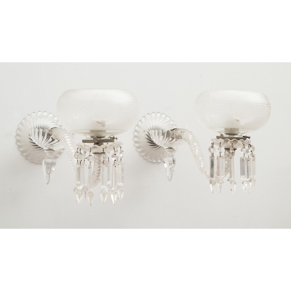 Due Lampade da parete ad una luce in cristallo trasparente, braccio a torchon curvo, diffusore sferico in vetro satinato e inciso a motivo geometrico, coppe e brindoli in cristallo.