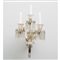 Lampada da parete a quattro luci in cristallo trasparente, braccio a torchon curvo, diffusore a forma di fiore con candela in vetro opalino, coppe e brindoli in cristallo, rotture alle candele.