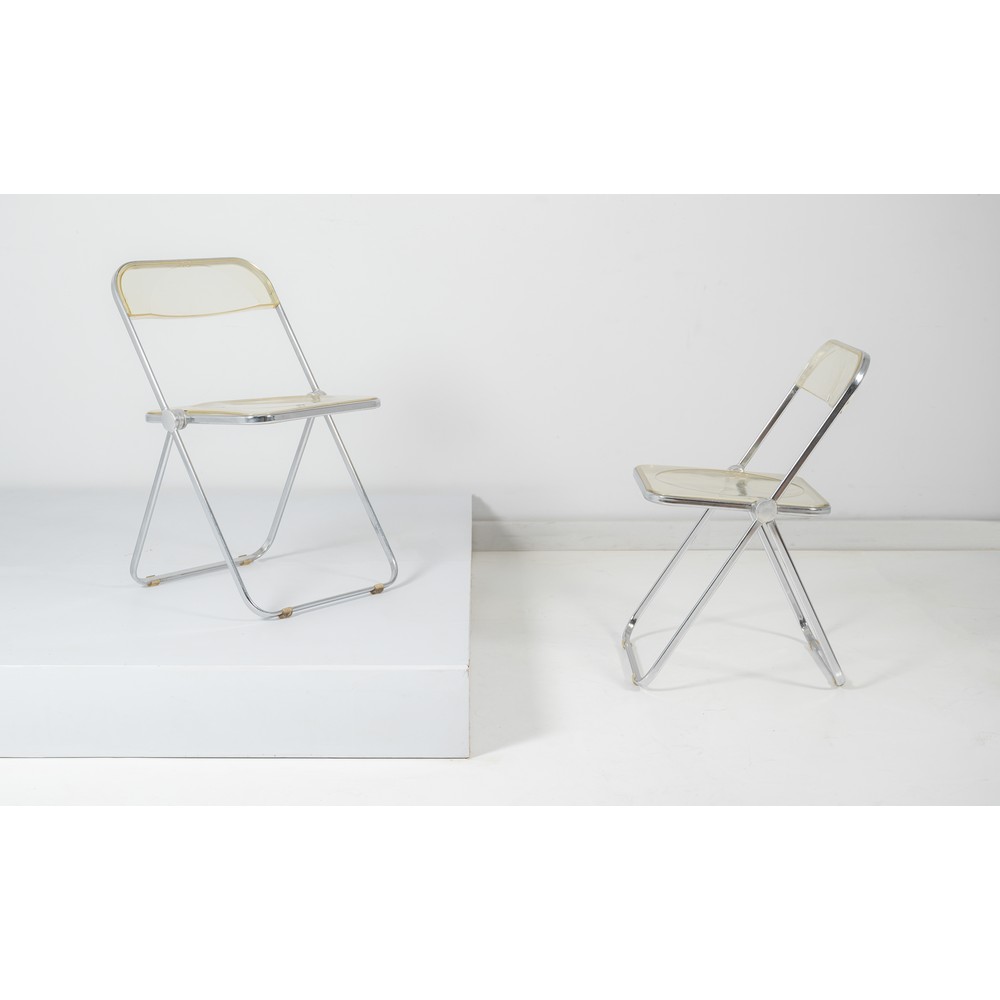 Coppia di sedie pieghevoli modello “Plia”, telaio in acciaio e polipropilene trasparente.