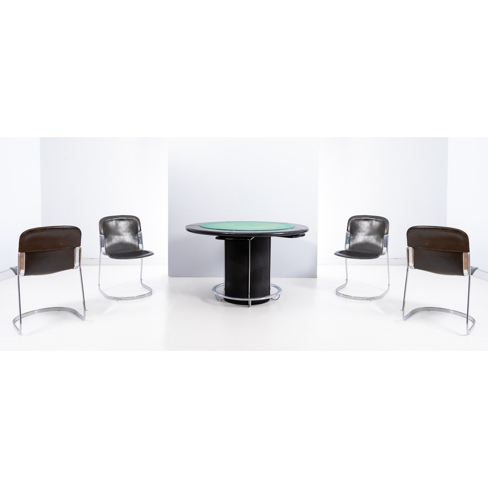 Tavolo da gioco, piano circolare ribaltabile, rivestito in panno verde, bordo con imbottitura in pelle nera, base cilindrica con pediera in acciaio; quattro sedie con struttura in acciaio e rivestimento in pelle nera. Difetti.