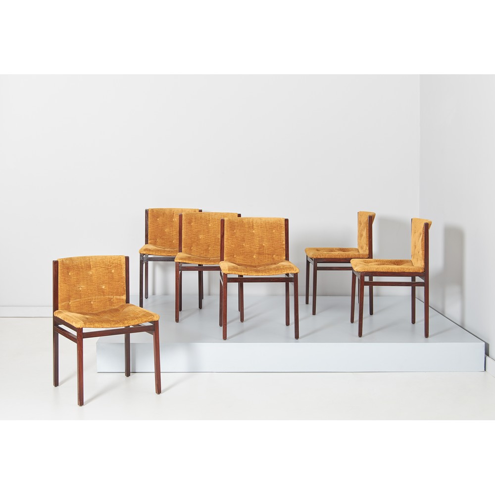 Tavolo da pranzo rotondo con allungo interno in legno di palissandro e sei sedie con seduta in tessuto.