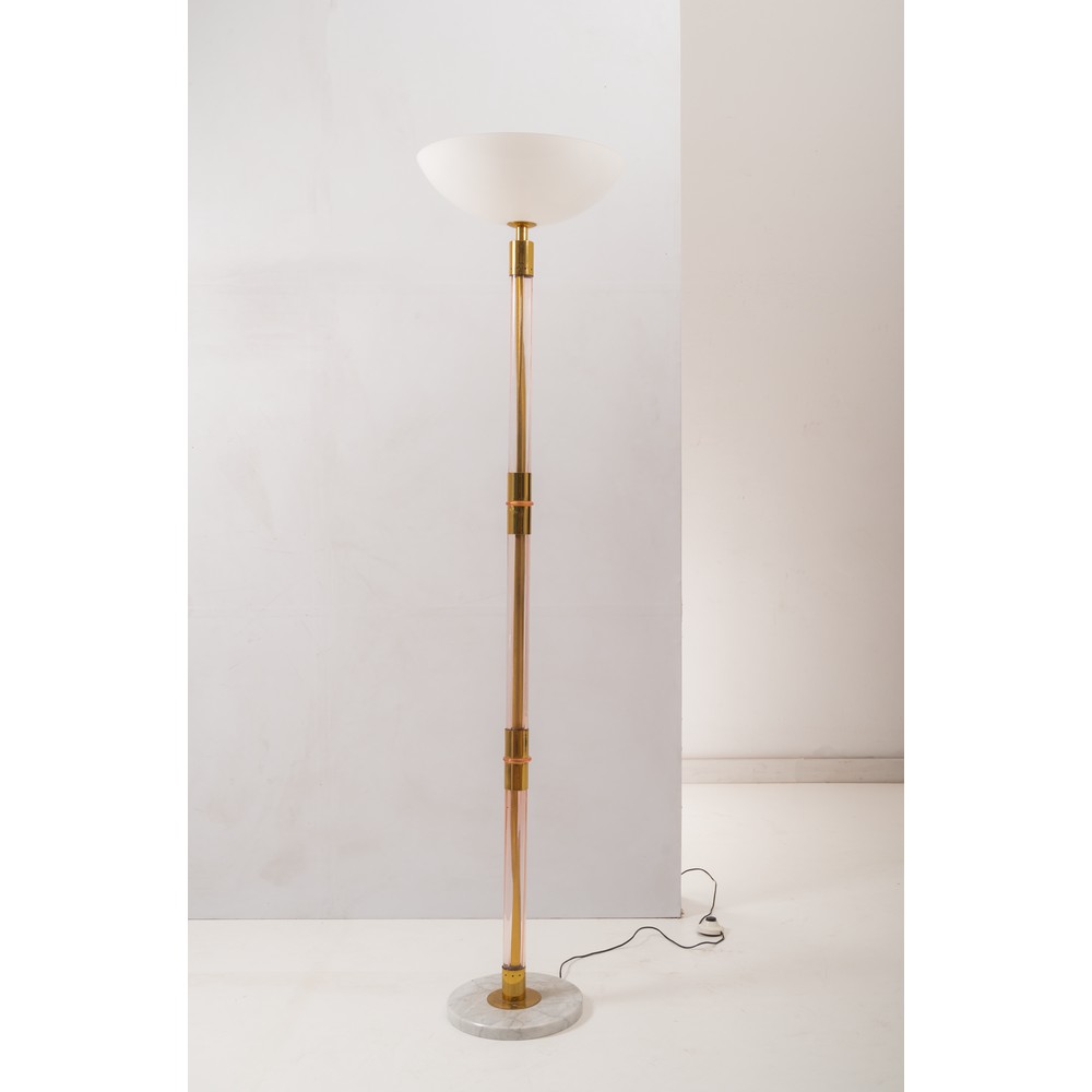Lampada da terra ad una luce, fusto tubolare in ottone e vetro rosa, diffusore semisferico in vetro lattimo, base circolare in marmo grigio.