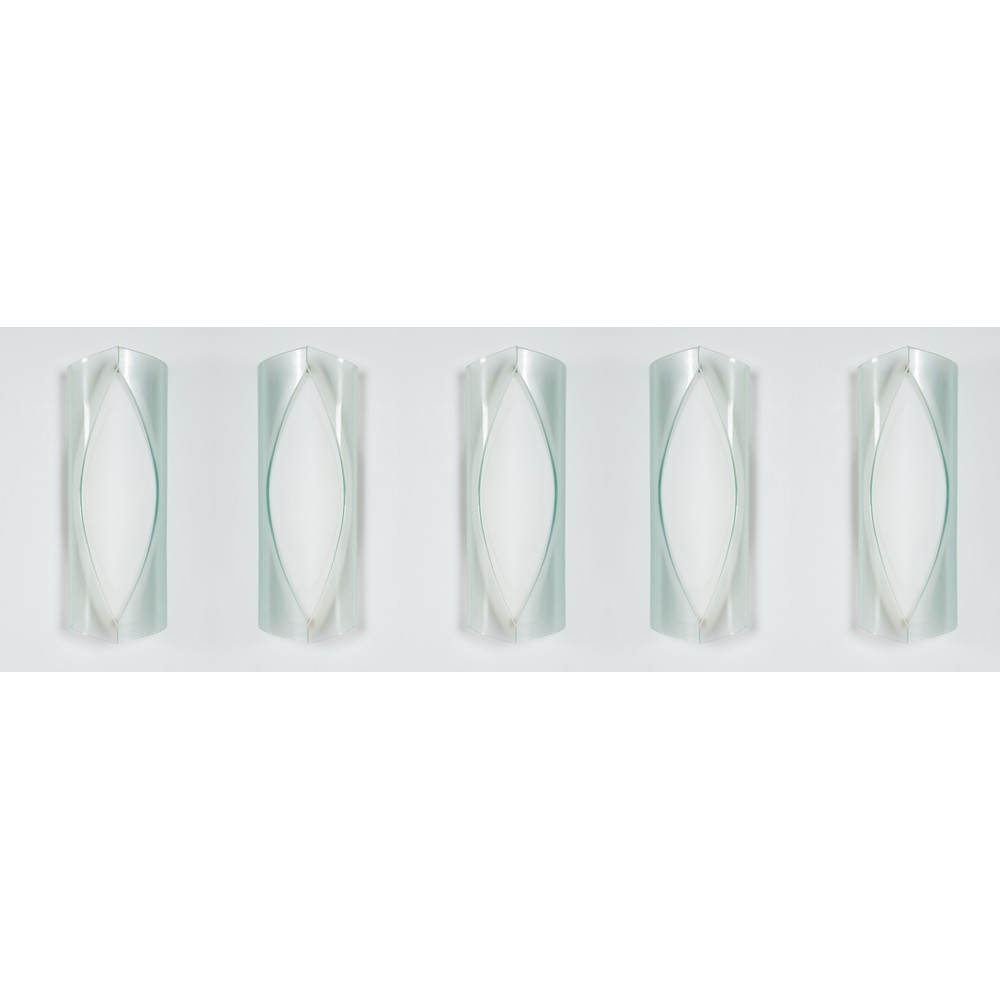 Cinque lampade da parete a due luci, struttura in metallo, diffusore cilindrico composto da due lastre di vetro trasparente ripiegate su un diffusore ellittico in vetro opale.