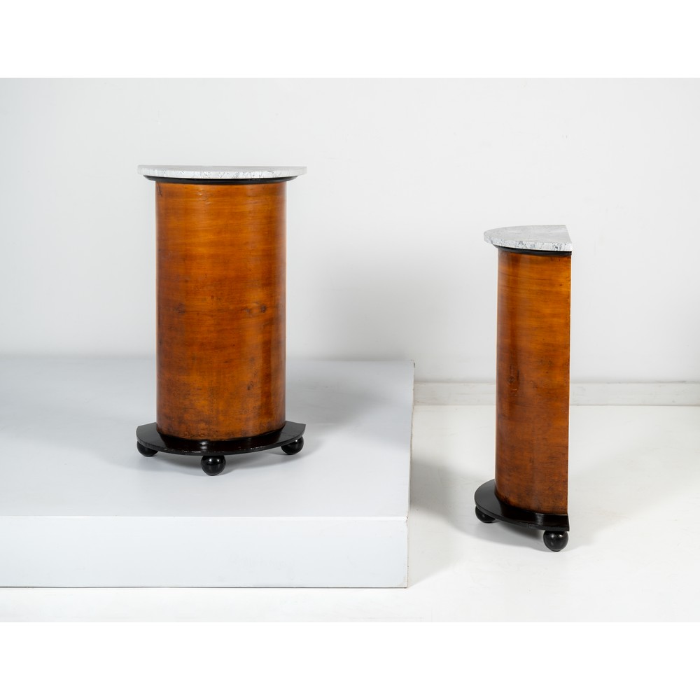 Coppia di consolle in legno di noce semicilindriche, piano in marmo grigio, base e piedi sferici in legno ebanizzato.