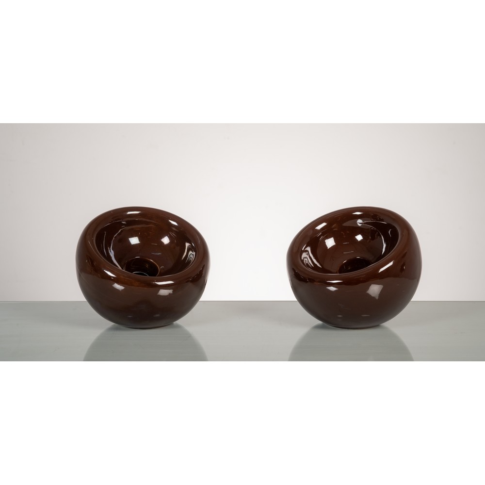 Coppia di lampade da tavolo ad una luce in ceramica smaltata marrone, corpo semisferico concavo.