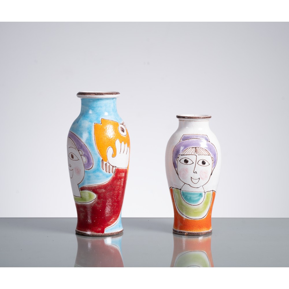 Due vasi in ceramica smaltata e decorata con figure femminili, corpo ovalizzato con collo e bocca leggermente estroflessa. Una sbeccatura al bordo. Firma alla base.