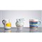 Una brocca in ceramica smaltata a decoro policromo geometrico di prodizione italiana.
