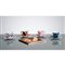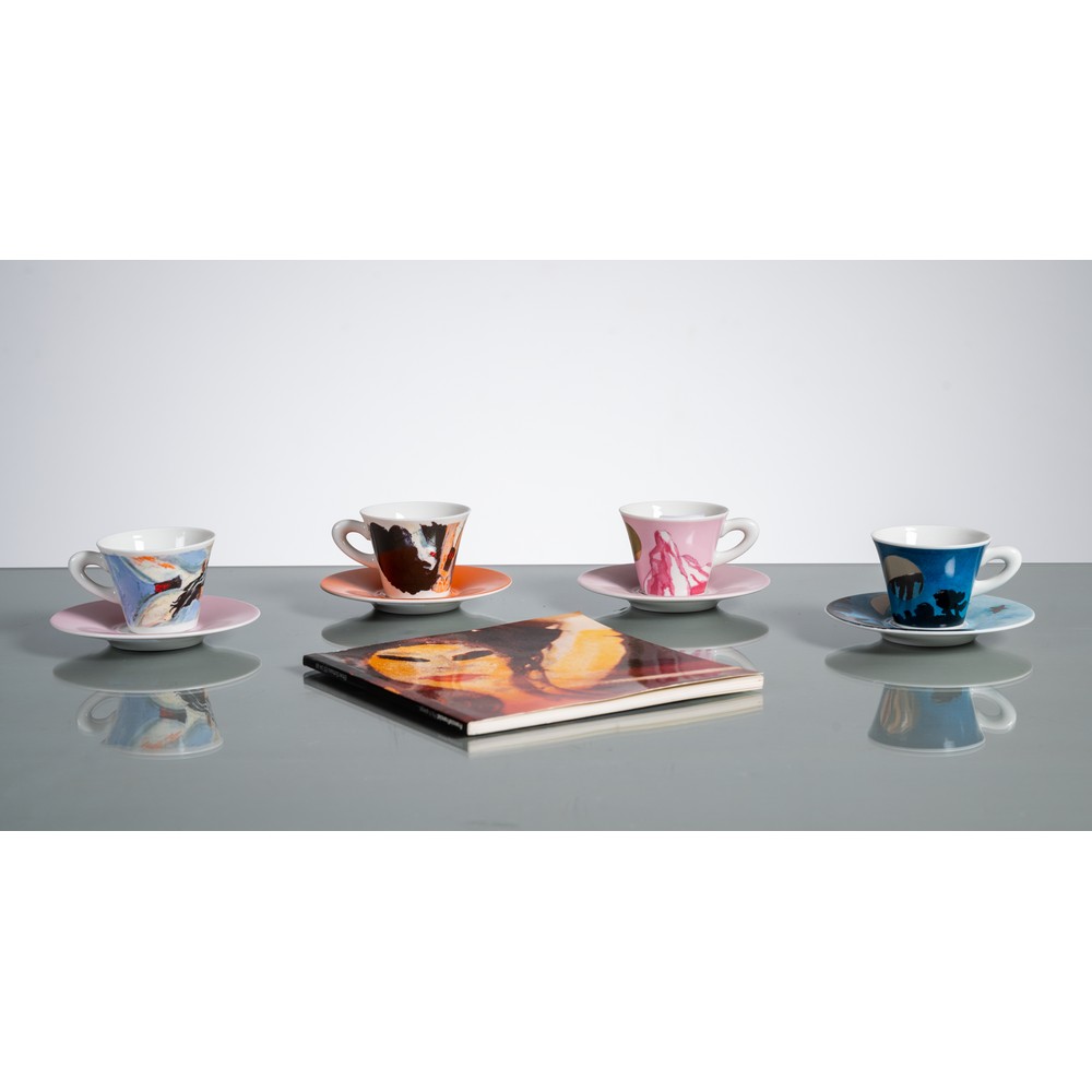 Quattro tazze da caffè con piattino della serie “Poi ti spiego”, ceramica con decori differenti. Firma alla base.