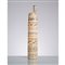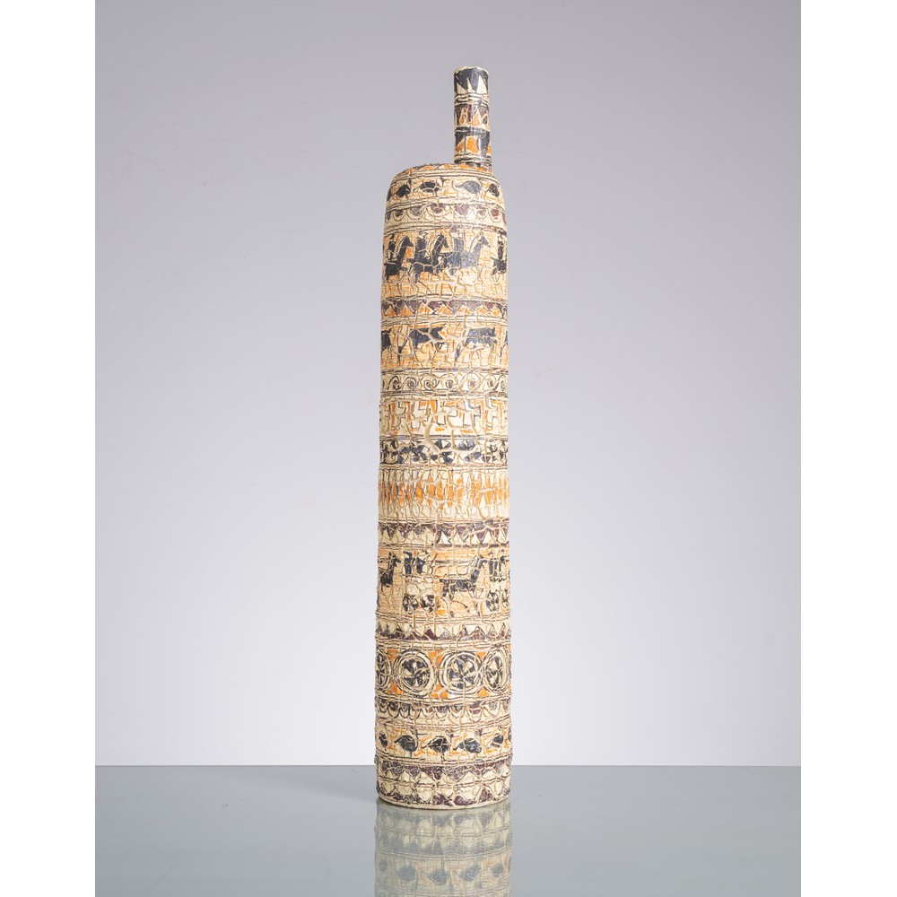 Grande vaso bottiglia in ceramica dipinta su fondo giallo, decoro in nero e arancione con figure primitive, corpo cilindrico e piccolo collo decentrato, bocca piana. Firma alla base.