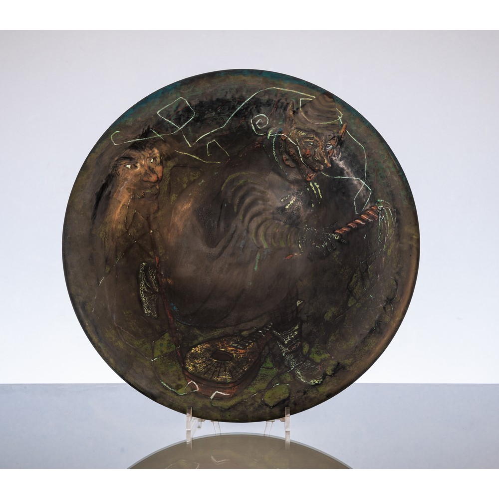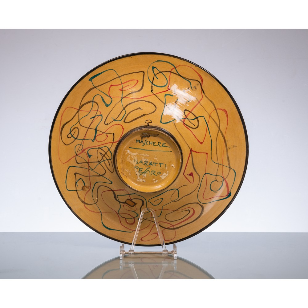 Piatto “Maschere”, circolare e concavo in ceramica dipinta in policromia su fondo nero, decoro con personaggi mascherati. Firma alla base.