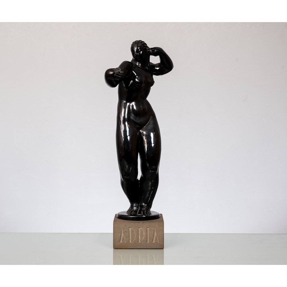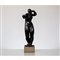 Scultura in ceramica invetriata nera raffigurante figura femminile, base quadrata in pietra.
