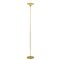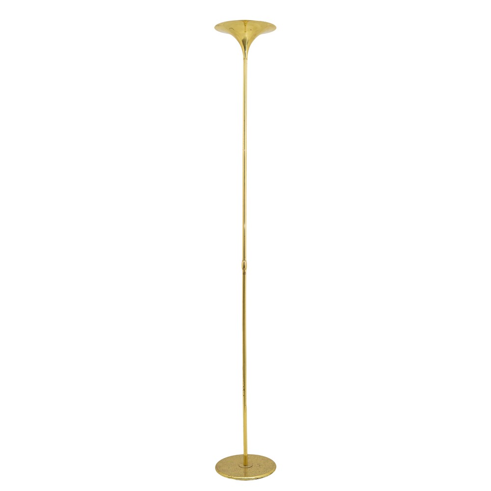 Lampada da terra ad una luce, struttura in ottone, stelo tubolare diffusore a tromba con bocca piana leggermente estroflessa, base circolare.