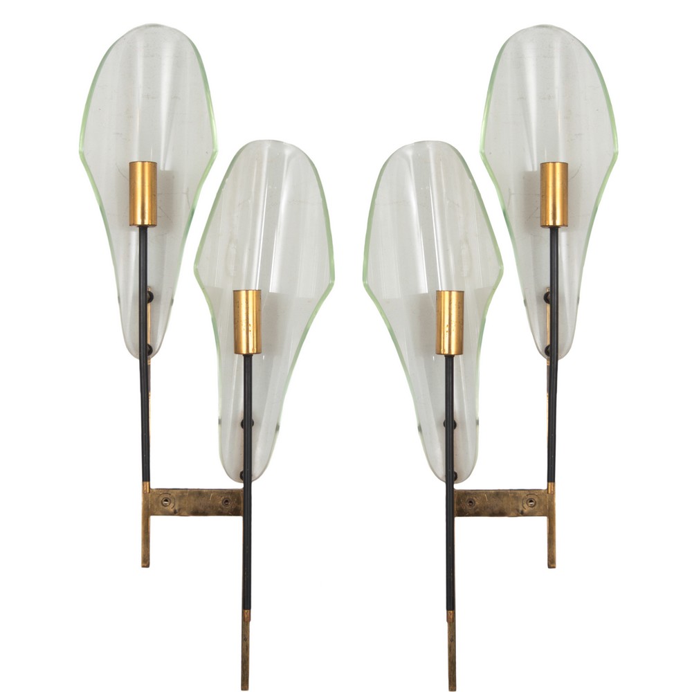 Coppia di lampade da parete a due luci, struttura in metallo verniciato nero ed ottone, diffusore sagomato in vetro trasparente.