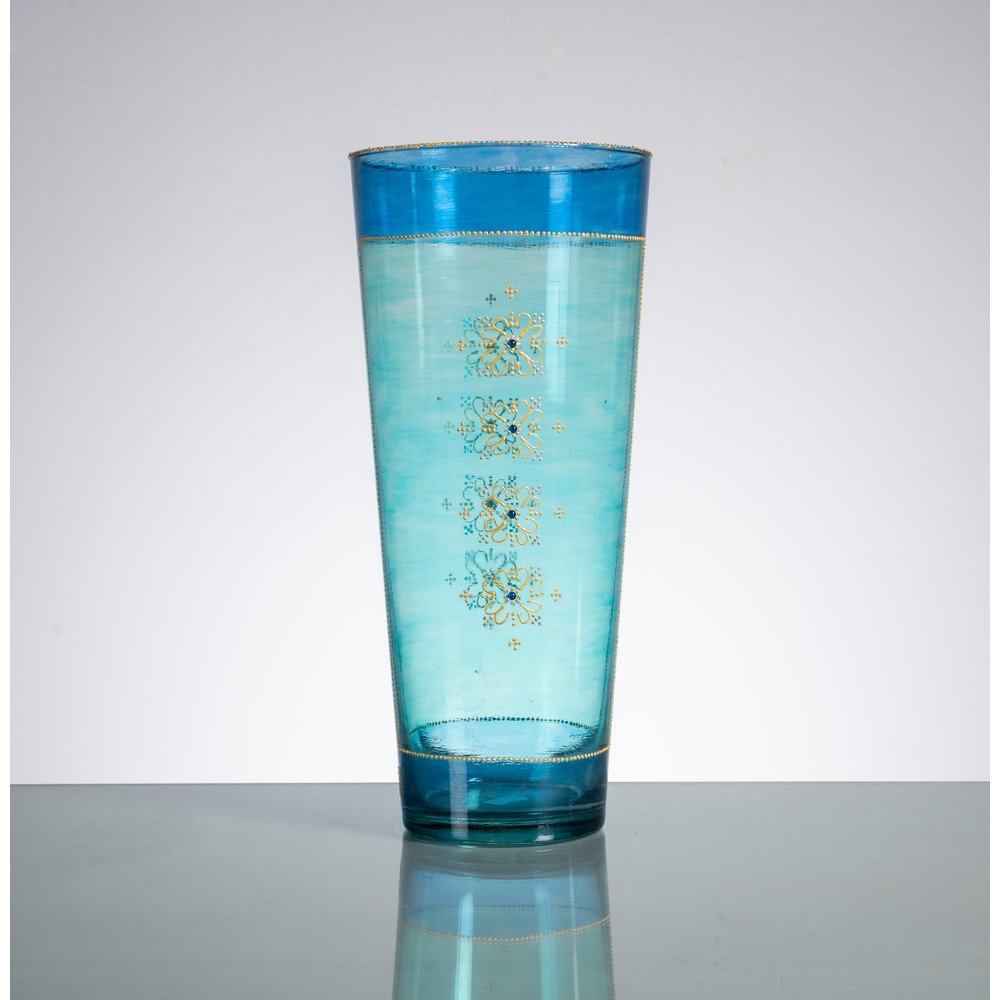 Vaso conico in vetro turchese ed azzurro, con decori a rilievo oro, bocca piana.