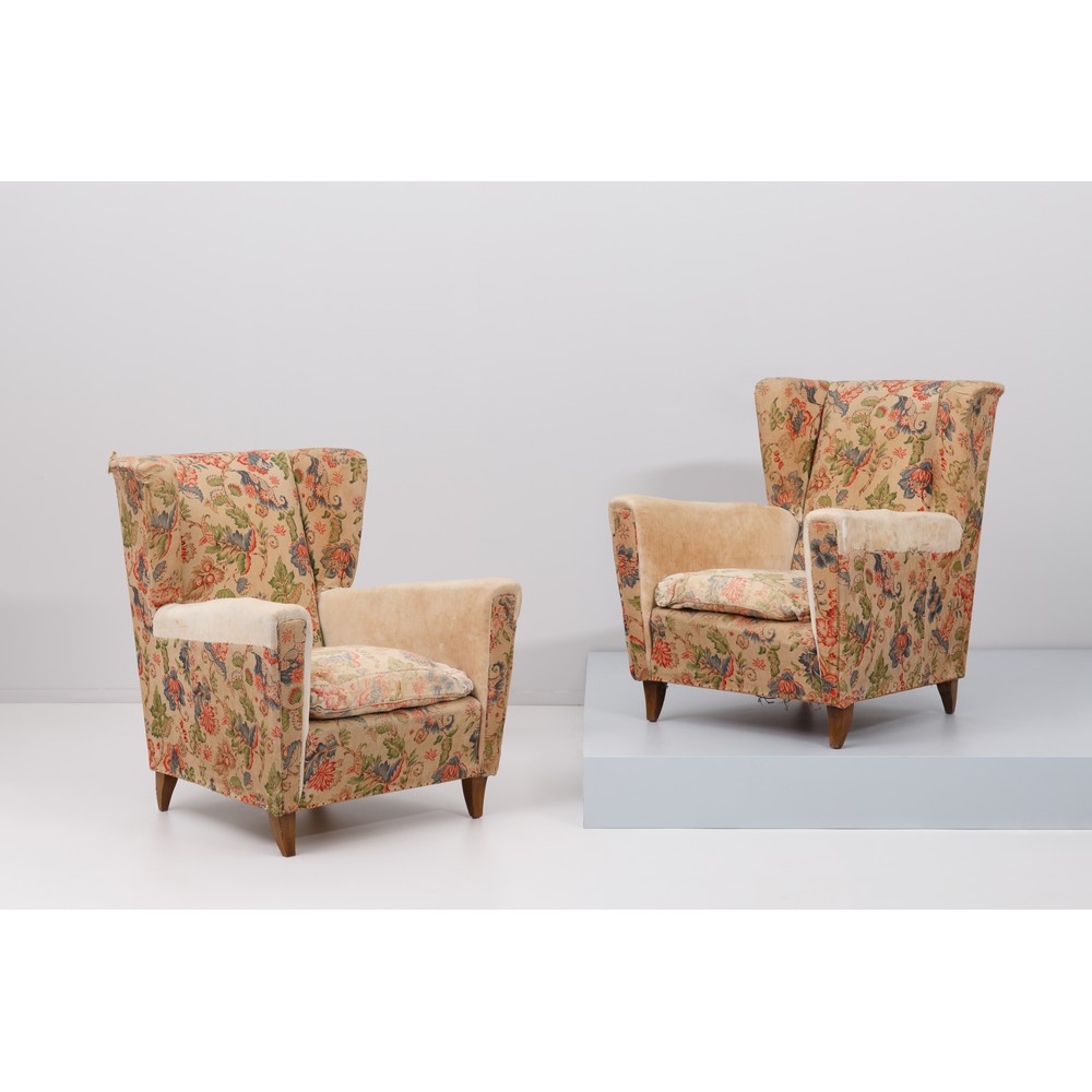 Coppia di poltrone ‘Bergere’, struttura in legno con imbottitura e rivestite in tessuto a fiori, piedi in legno. Da restaurare