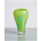 Vaso in vetro sommerso, corpo a pera nei toni del verde e decorato con grosse murrine, bocca piana leggermente introflessa, base in vetro trasparente.