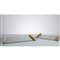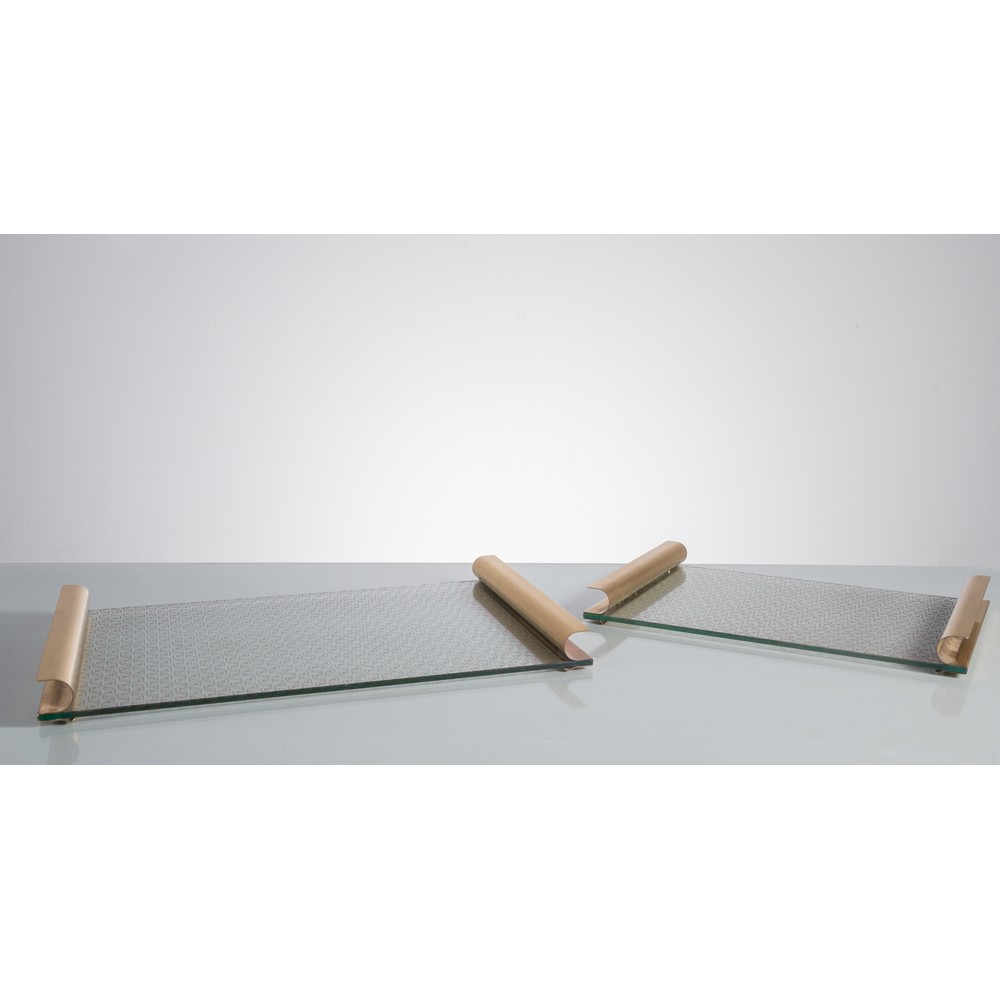 Due vassoi rettangolari di grandezza diversa in vetro stampato a decori geometrici, manici in metallo dorato.