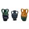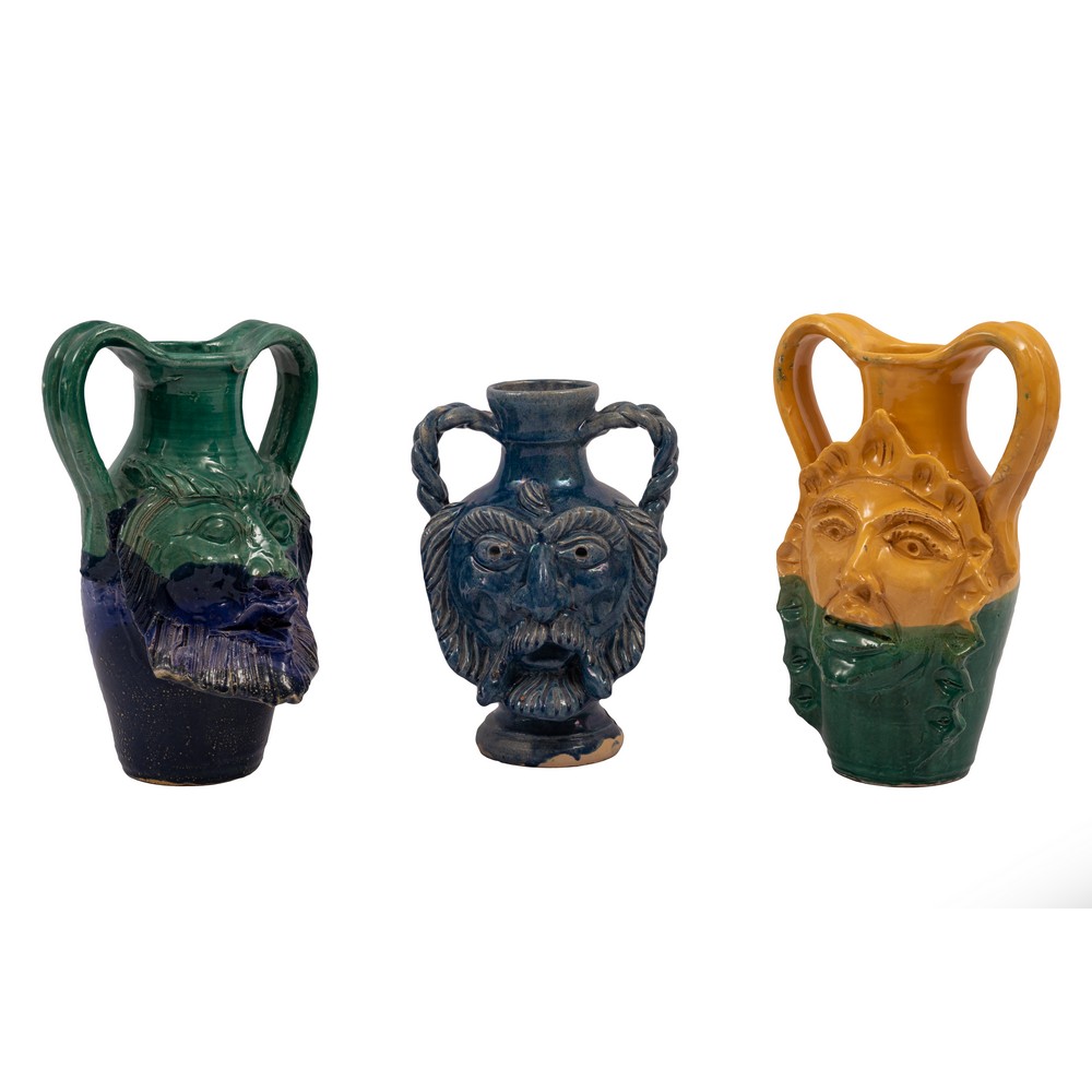 TRE VASI raffiguranti maschere apotropaiche in ceramica smaltata e decorata.