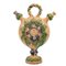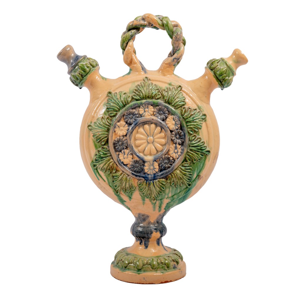 GRANDE FIASCA in ceramica decorata e smaltata, con manico intrecciato.