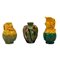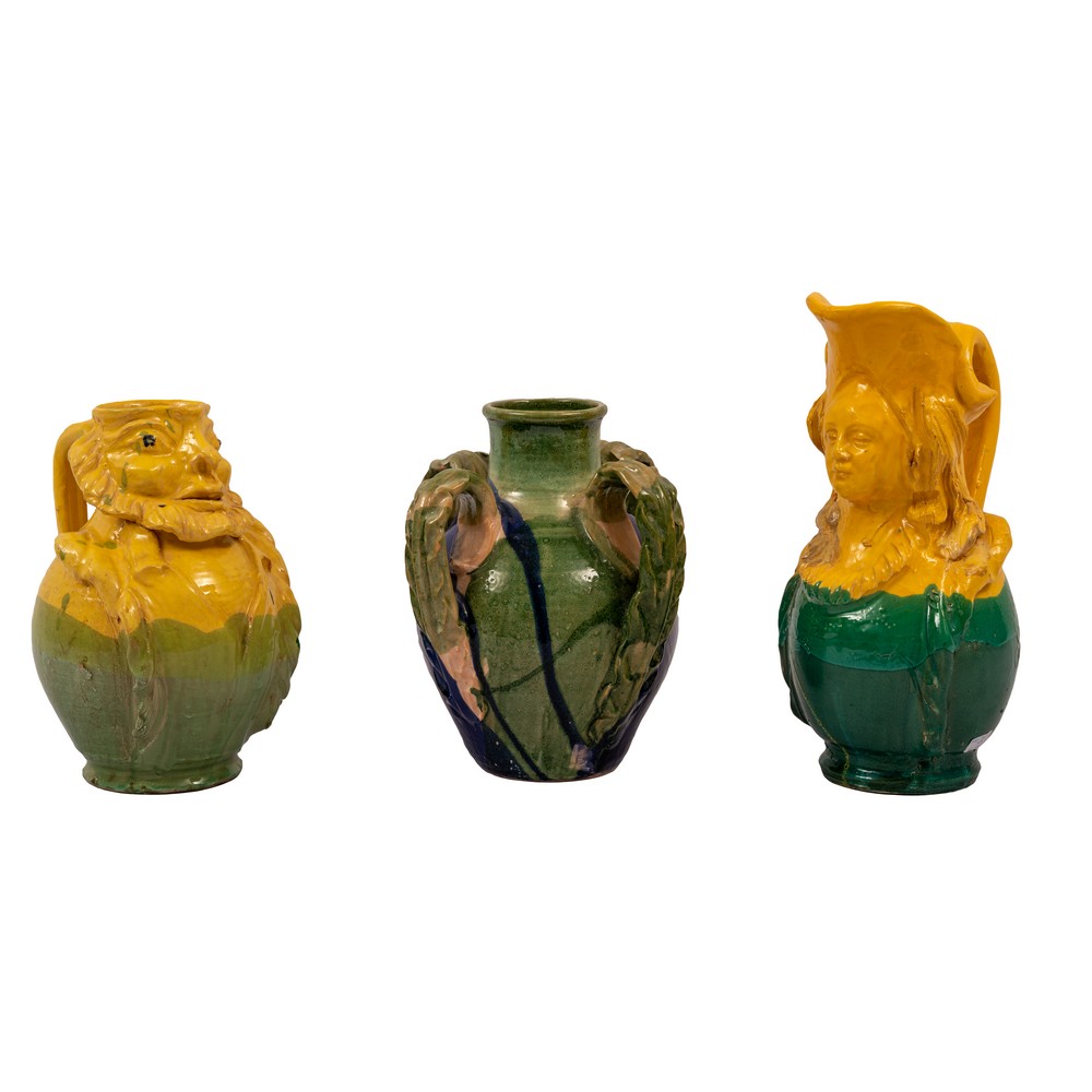 DUE BROCCHE E UN VASO raffiguranti maschere apotropaiche, in ceramica smaltata e decorata.